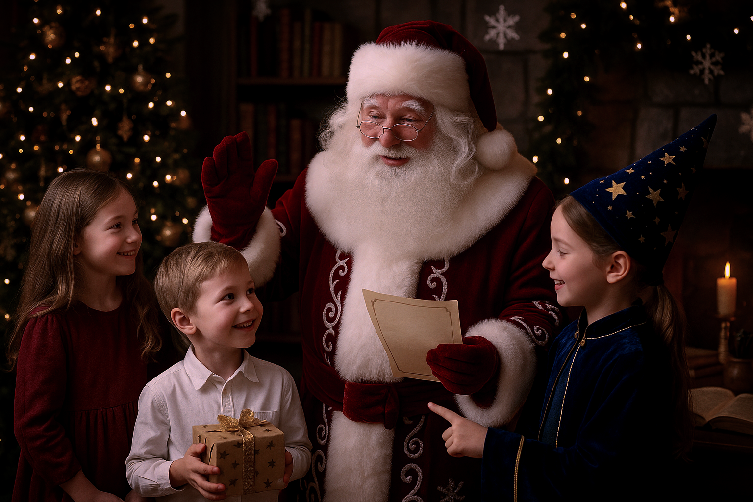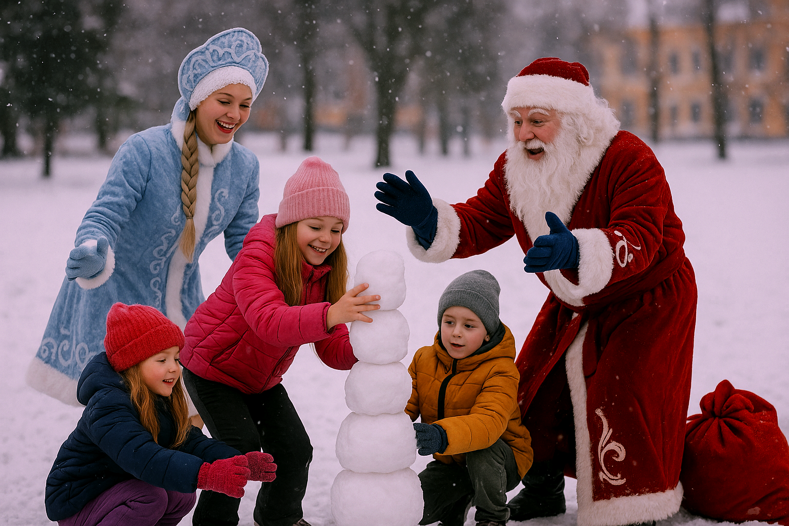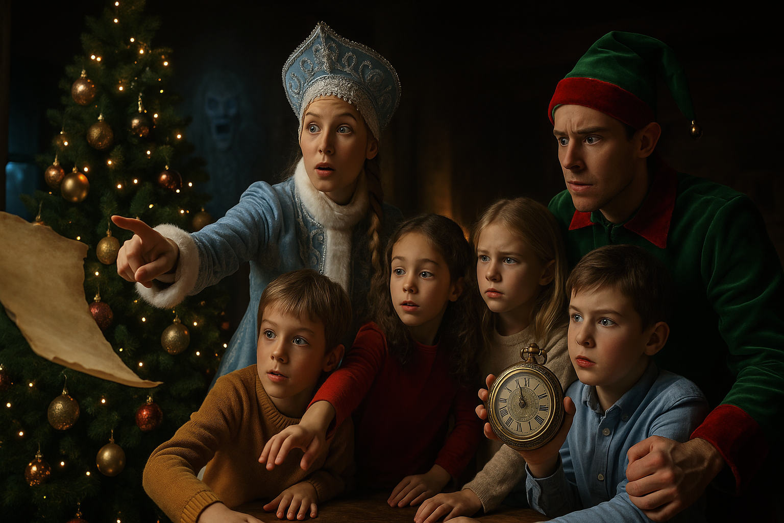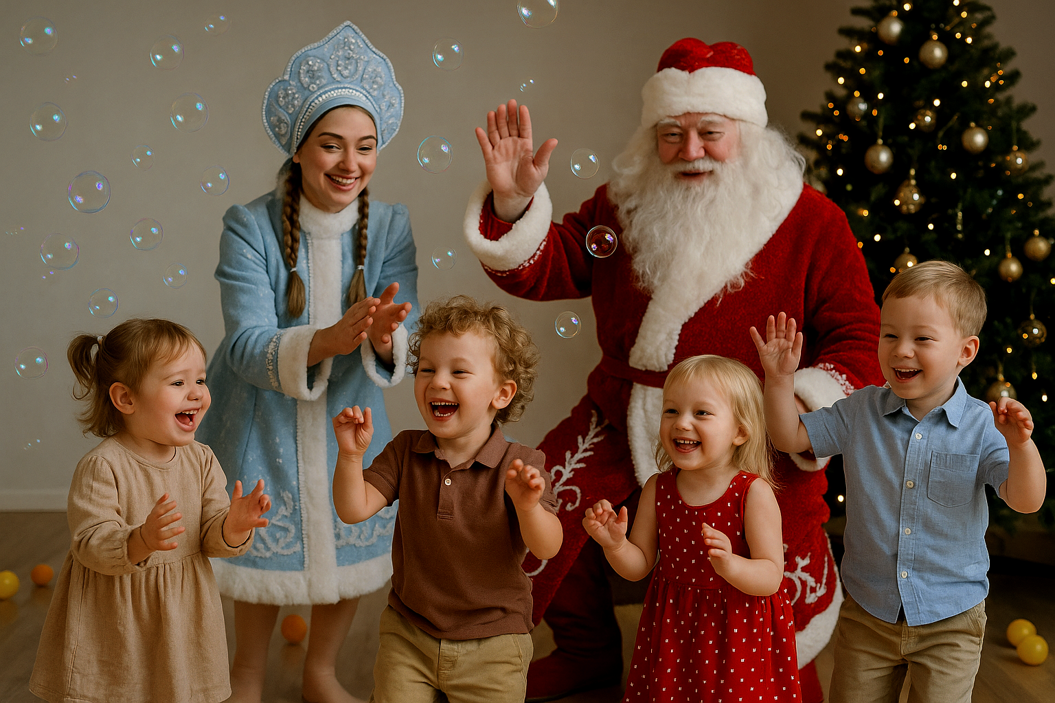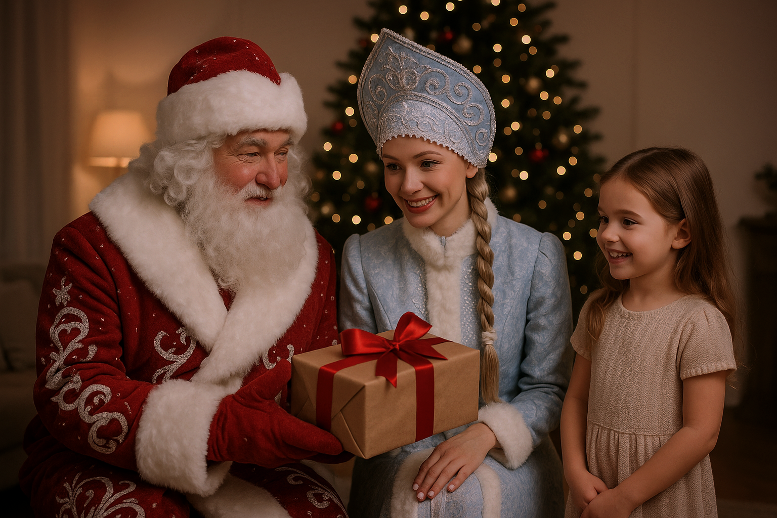 Ведущая рассказывает сказку, играет с детьми, потом приходит Дед Мороз, который “сертифицирует” их работы.